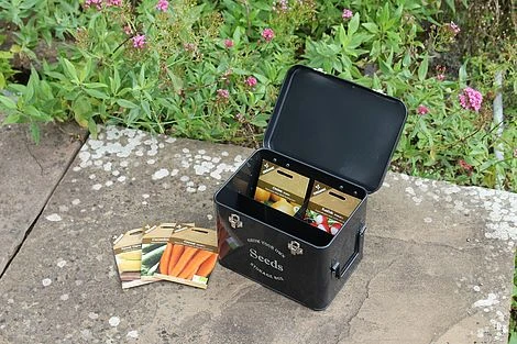 A stylish looking seed tin in midnight black, an ideal way to organise and store packets of seeds keeping them safe and dry.