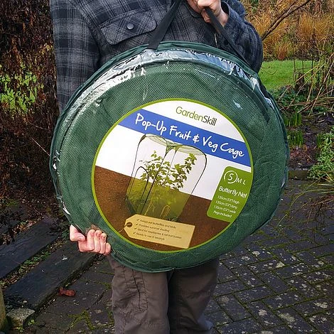 A quick and easy solution for protecting cabbages, cauliflowers, other brassicas and medium height fruit bushes such as blueberries from bird, cabbage white and pest attack. Our Pop-Up Cabbage & Brassica Veg Cage assembles instantly with no tools needed – simply open the bag, pop up and peg down! This weatherproof and wind-resistant plant cover has a strong but flexible spring steel frame and it can be moved around the garden with ease. The 4mm woven PP mesh offers shading from the sun while allowing air and moisture to penetrate, ensuring a healthy microclimate for plants. A large zipped door gives easy access to crops. Ideal for both home and allotment use and can be popped on raised beds, planters or grow patches.