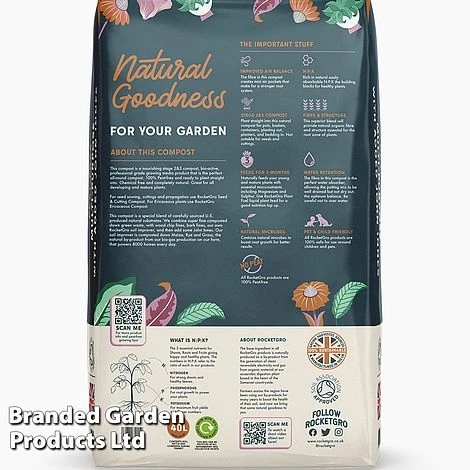 A nutrient rich, 100% organic, chemical-free and peat-free multi-purpose compost for organic growers. RocketGro Multi-Purpose Compost is a superior blend of professional quality compost for pots, containers, window boxes, planters, hanging baskets and planting out. Contains the perfect balance of nutrients to feed your young and mature plants for 3 months without the need for fertiliser top-ups. Its fine texture makes it lovely to work with and it is ready to plant straight into or use for potting up.