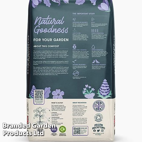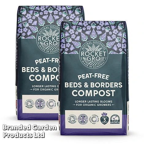 A nutrient rich, 100% organic, chemical-free and peat-free all-round plant and shrub compost for organic growers. RocketGro Peat Free Beds and Borders compost is a superior blend of professional quality compost which will boost soil health, root growth and strengthen your plants and shrubs. Ready to plant straight in to, it naturally feeds your young and mature plants with essential micro-nutrients and N:P:K. for 3 months.